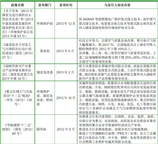 根據《國務(wù)院關(guān)于印發(fā)大氣污染防治行動(dòng)計劃的通知》(國發(fā)〔2013〕37號)的要求,到2017 年,全國地級及以上城市可吸入顆粒物濃度比2012 年下降10%以上;京津冀、長(cháng)三角、珠三角等區域細顆粒物濃度分別下降25%、20%、15%左右;加快重點(diǎn)行業(yè)脫硫、脫硝、除塵改造工程建設。所有燃煤電廠(chǎng)、鋼鐵企業(yè)的燒結機和球團生產(chǎn)設備、石油煉制企業(yè)的催化裂化裝置、有色金屬冶煉企業(yè)都要安裝脫硫設施,每小時(shí)20 蒸噸及以上的燃煤鍋爐要實(shí)施脫硫。除循環(huán)流化床鍋爐以外的燃煤機組均應安裝脫硝設施,新型干法水泥窯要實(shí)施低氮燃燒技術(shù)改造并安裝脫硝設施。燃煤鍋爐和工業(yè)窯爐現有除塵設施要實(shí)施升級改造;京津冀、長(cháng)三角、珠三角等區域要于2015 年底前基本完成燃煤電廠(chǎng)、燃煤鍋爐和工業(yè)窯爐的污染治理設施建設與改造,完成石化企業(yè)有機廢氣綜合治理。
