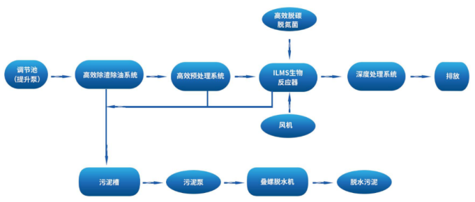ILMS工藝是以ILMS高效生物反應器為核心處理單元,通過(guò)前端高效物化預處理和尾端深度凈化實(shí)現垃圾中轉站壓濾液的達標排放,該工藝流程圖如下: